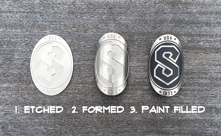 Switzer soon discovered that individually etching, painting, and forming the head badges would prove to be difficult and time-consuming, requiring meticulous finishing operations. To lessen material handling as much as possible, Switzer processed the badges in sheet form, minimizing handling while maximizing output. The badge images were etched down and painted in sheet form, then individually punched and formed.